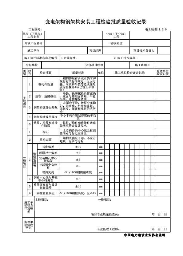 表格名称:电土验表11.2.9 变电架构钢架构安装工程检验批质量验收记录