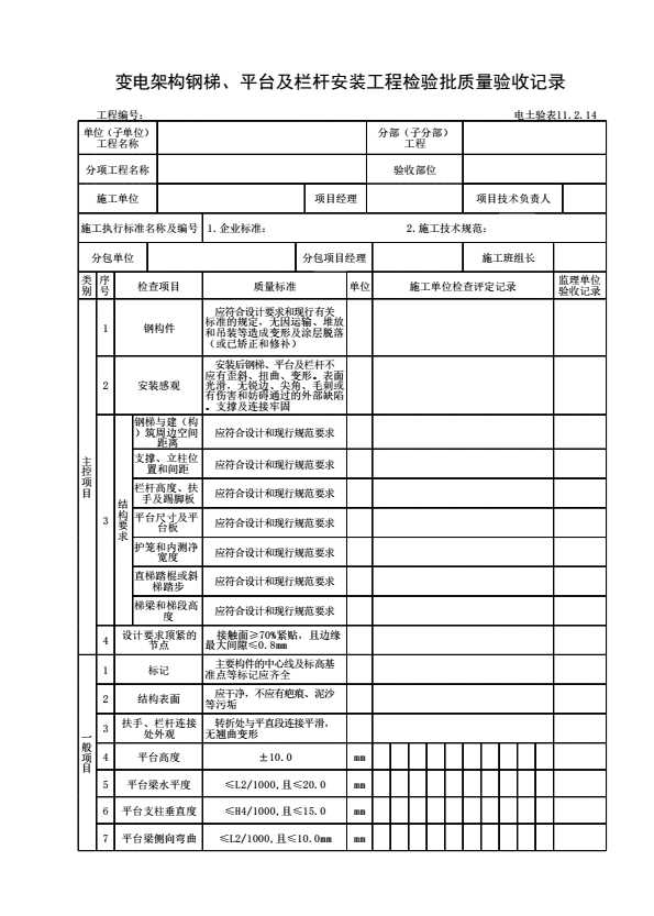 表格名称:电土验表11.2.14 变电架构铡梯、平台及栏杆安装工程检验批质量验收记录