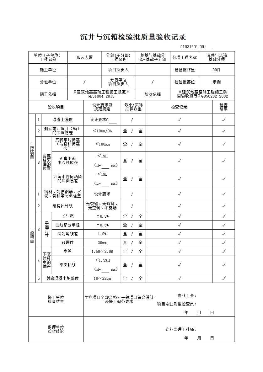 沉井与沉箱检验批质量验收记录