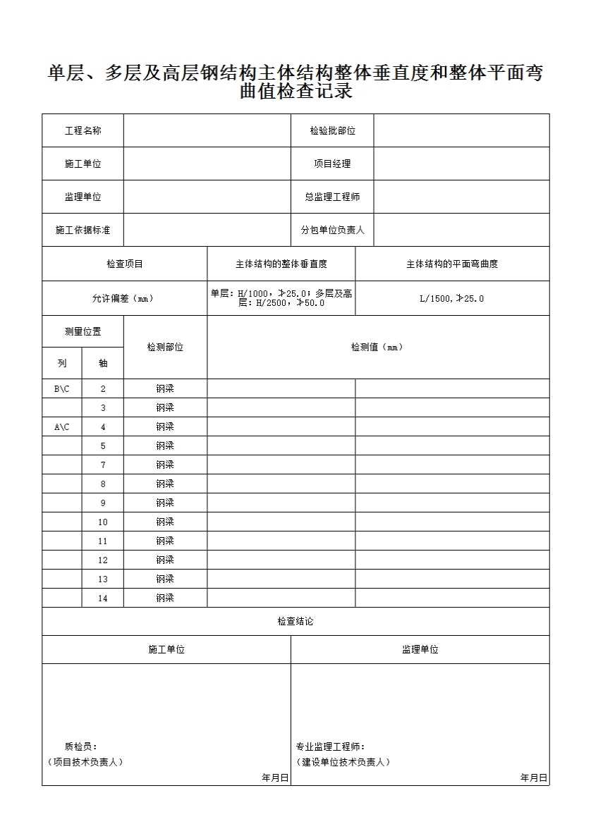 表格名称:单层、多层及高层钢结构主体结构整体垂直度和整体平面弯曲值检查记录
