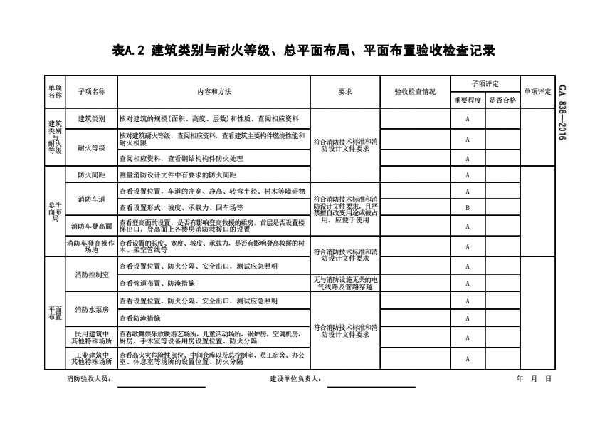 表A.2 建筑类别与耐火等级、总平面布局、平面布置验收检查记录