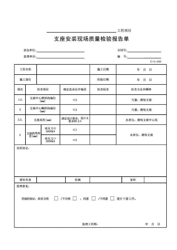 表格名称:C-1-183 支座安装现场质量检验报告单