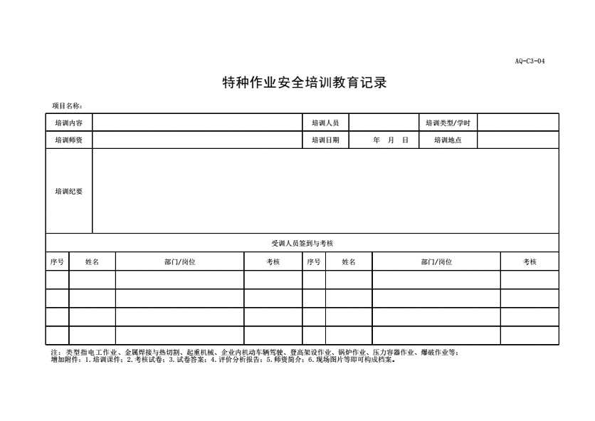 表格名称:AQ-C3-04特种作业安全培训教育记录