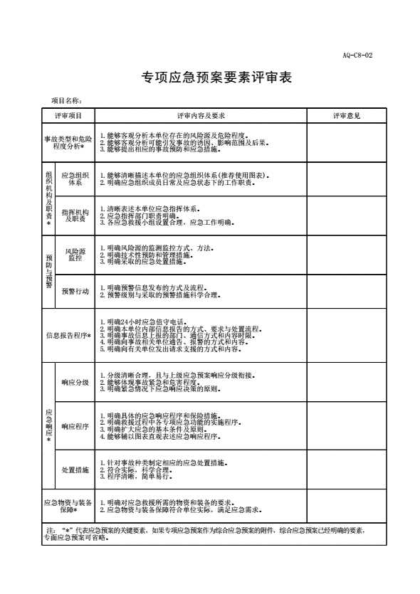 表格名称:AQ-C8-02专项应急预案要素评审表