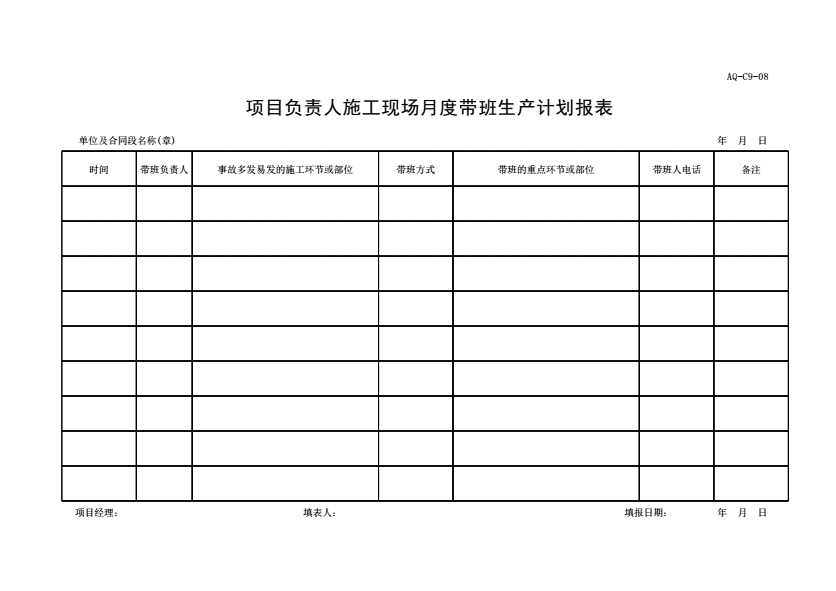 表格名称:AQ-C9-08项目负责人施工现场月度带班生产计划报表