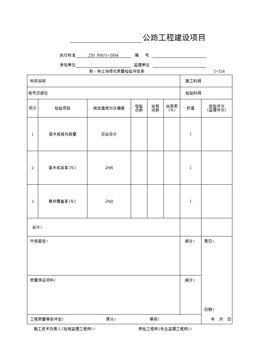 表格名称:C-216表 取、弃土场绿化质量检验评定表