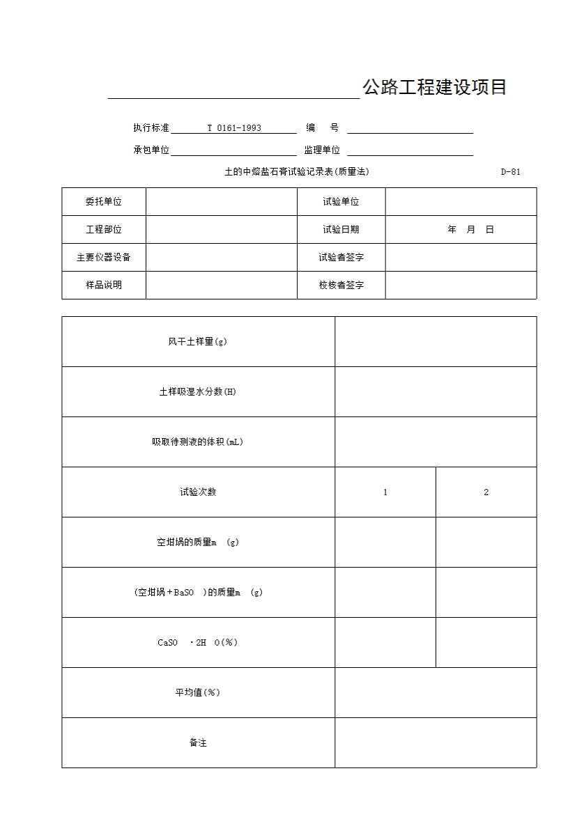 表格名称:D-81 土的中熔盐石膏试验记录表(质量法)