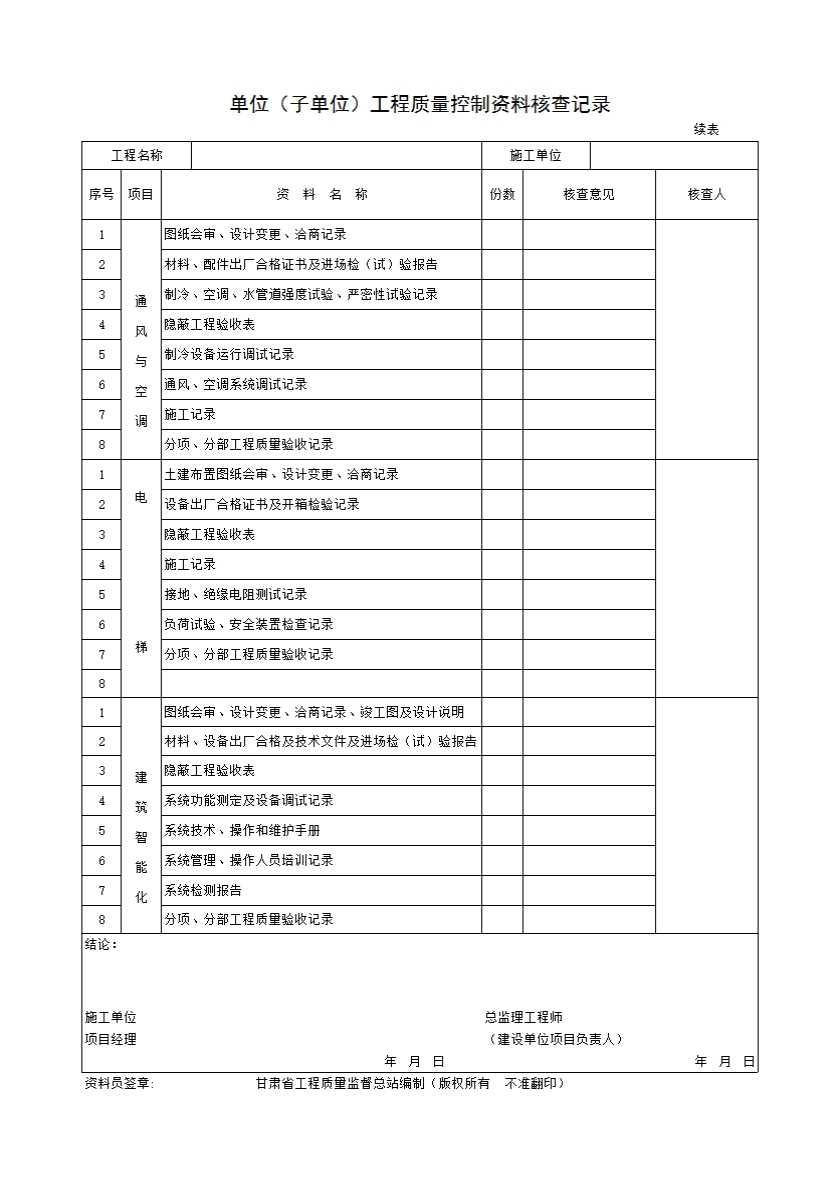 表格名称:单位(子单位)工程质量控制资料核查记录G.0.1-2