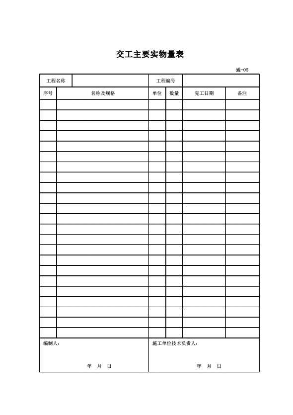 表格名称:通-05 交工主要实物量表
