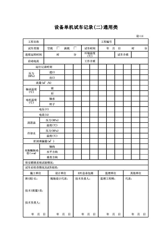 表格名称:设-14 设备单机试车记录(二)通用类
