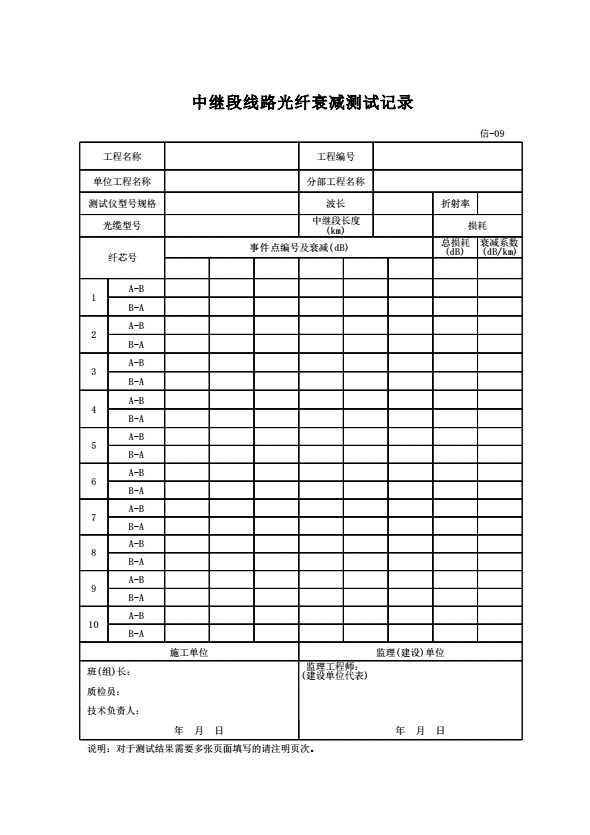 表格名称:信-09 中继段线路光纤衰减测试记录