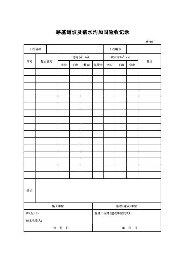 表格名称:路-03 路基道坡及截水沟加固验收记录