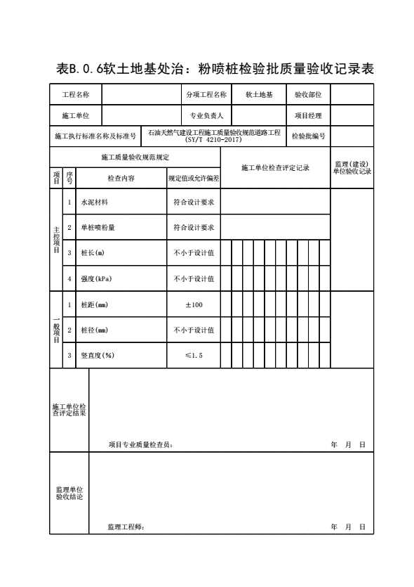 表B.0.6 软土地基处治:粉喷桩检验批质量验收记录表