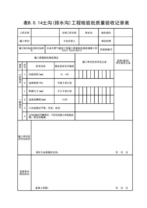 表B.0.14 土沟(排水沟)工程检验批质量验收记录表