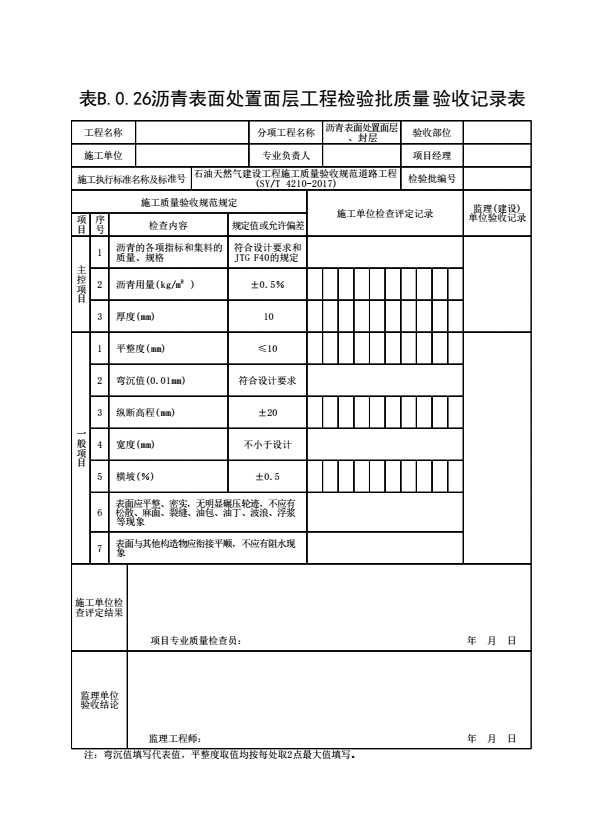 表格名称:表B.0.26 沥青表面处置面层工程检验批质量验收记录表