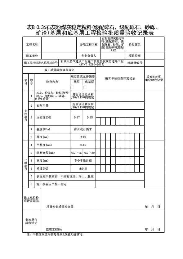 表格名称:表B.0.36 石灰粉煤灰稳定粒料(级配碎石、级配砾石、砂砾、矿渣)基层和底基层工程检验批质量验收记录表
