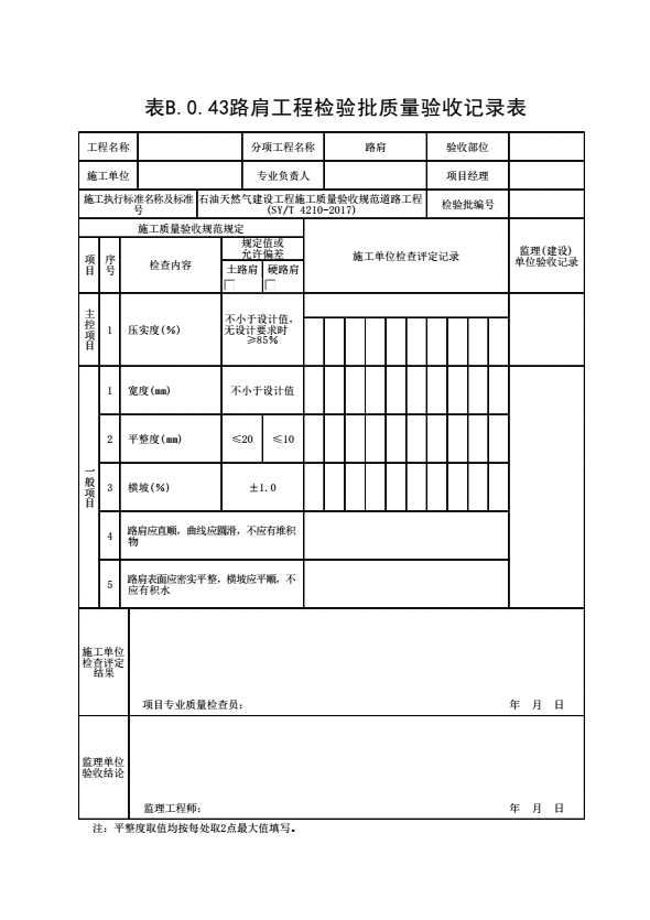 表格名称:表B.0.43 路肩工程检验批质量验收记录表