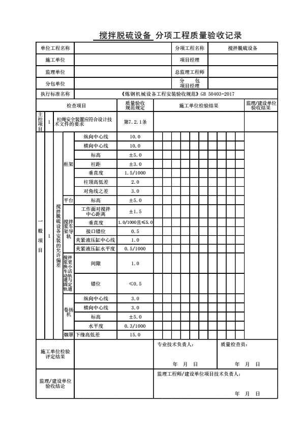 表格名称:搅拌脱硫设备分项工程质量验收记录