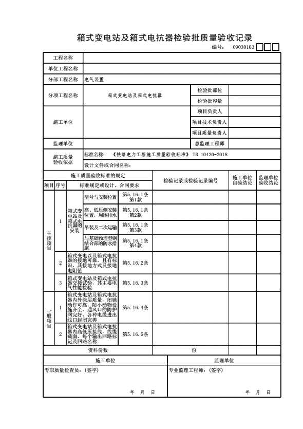 表格名称:09030103 箱式变电站及箱式电抗器检验批质量验收记录