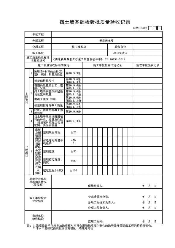 表格名称:G02013802 挡土墙基础检验批质量验收记录
