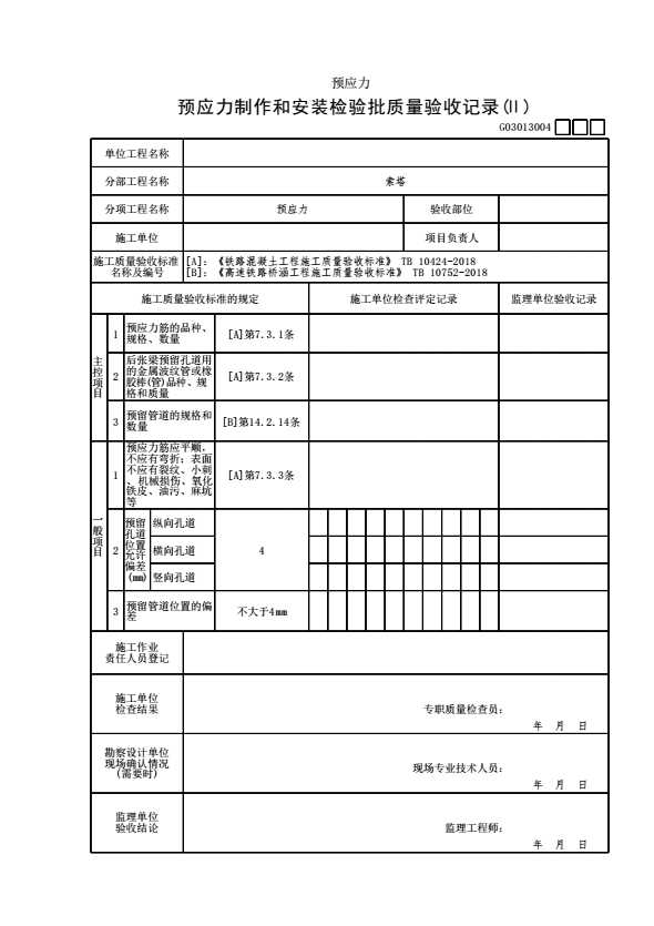 表格名称:G03013004 【预应力】预应力制作和安装检验批质量验收记录(Ⅱ)
