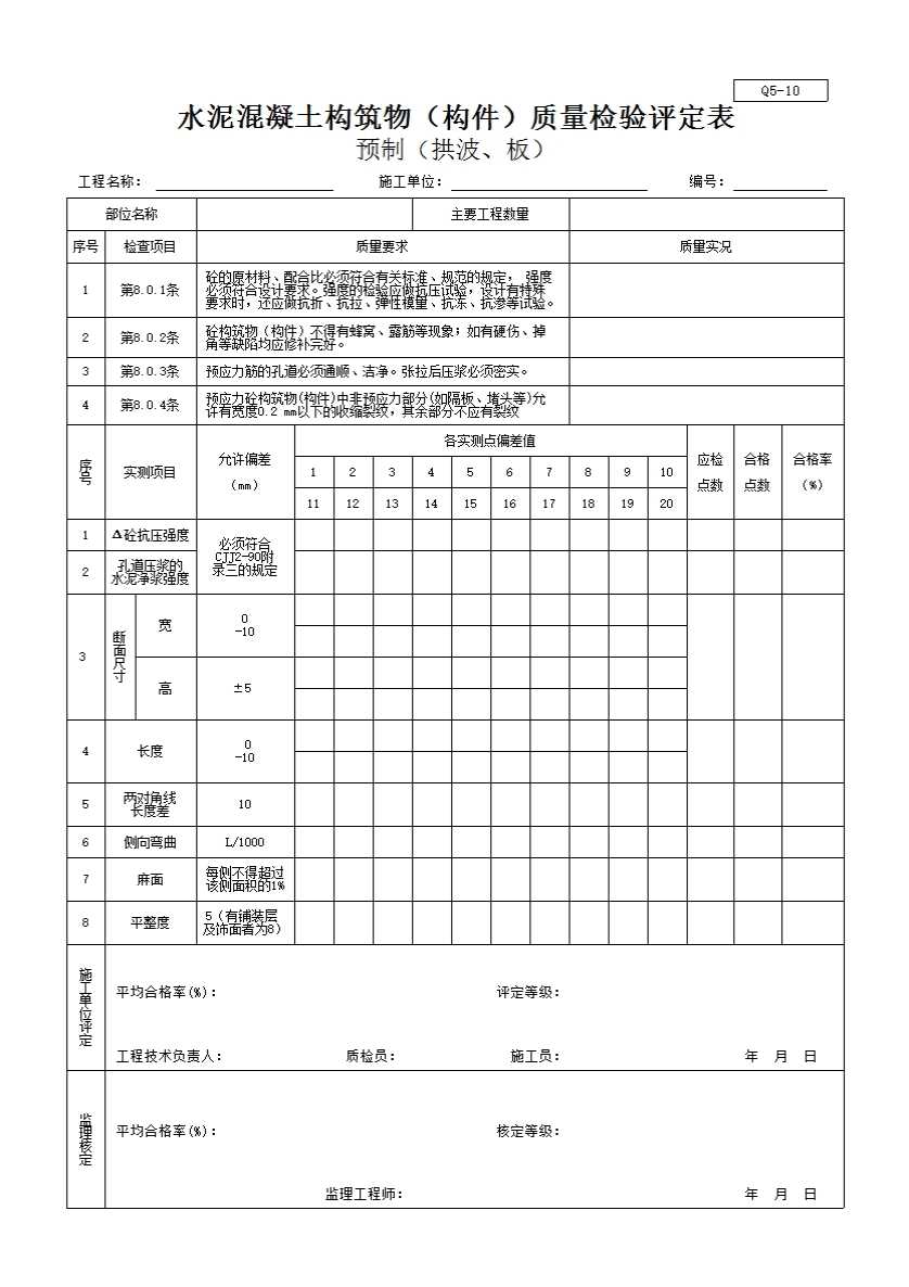 表格名称:水泥混凝土构筑物(构件)质量检验评表预制(拱波、板)