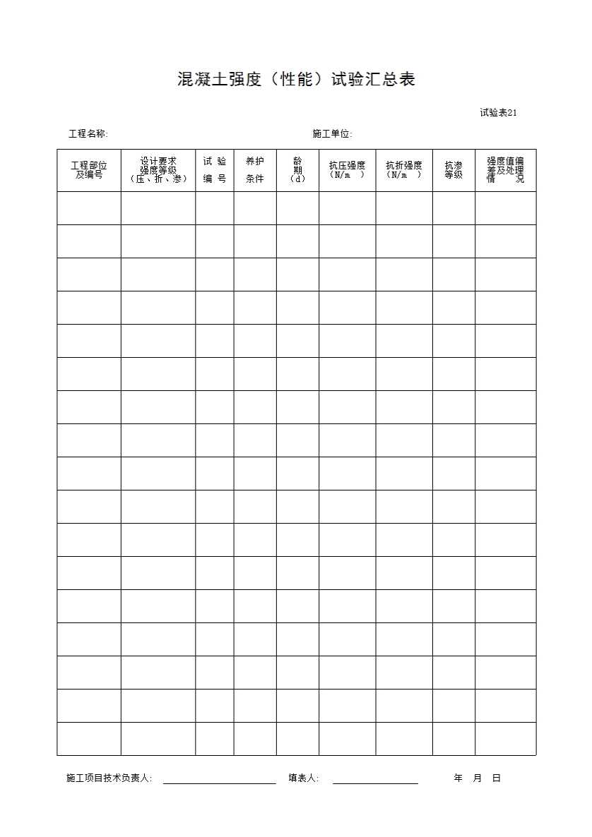 表格名称:试验表21 混凝土强度(性能)试验汇总表