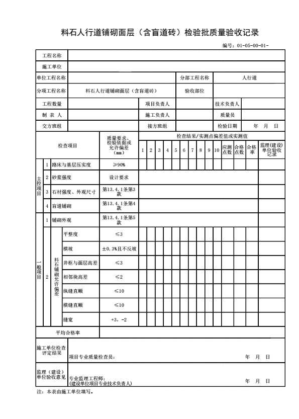 表格名称:料石人行道铺砌面层(含盲道砖)检验批质量验收记录