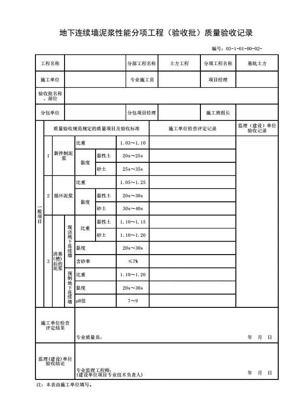 表格名称:地下连续墙泥浆性能分项工程(验收批)质量验收记录