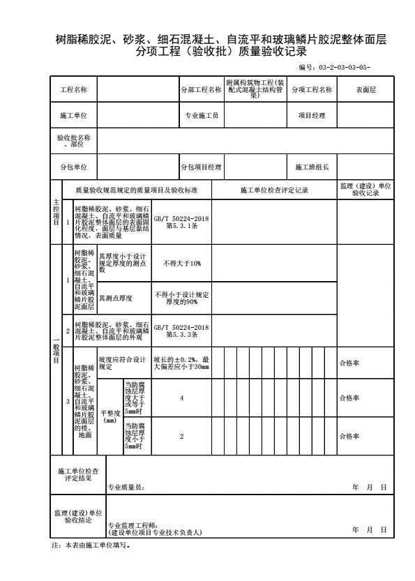 表格名称:树脂稀胶泥、砂浆、细石混凝土、自流平和玻璃鳞片胶泥整体面层分项工程(验收批)质量验收记录