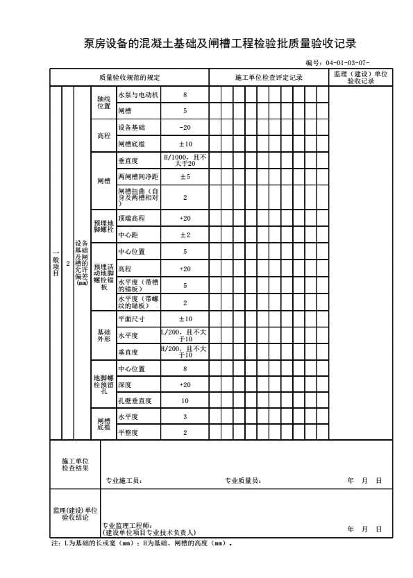 表格名称:泵房设备的混凝土基础及闸槽工程检验批质量验收记录