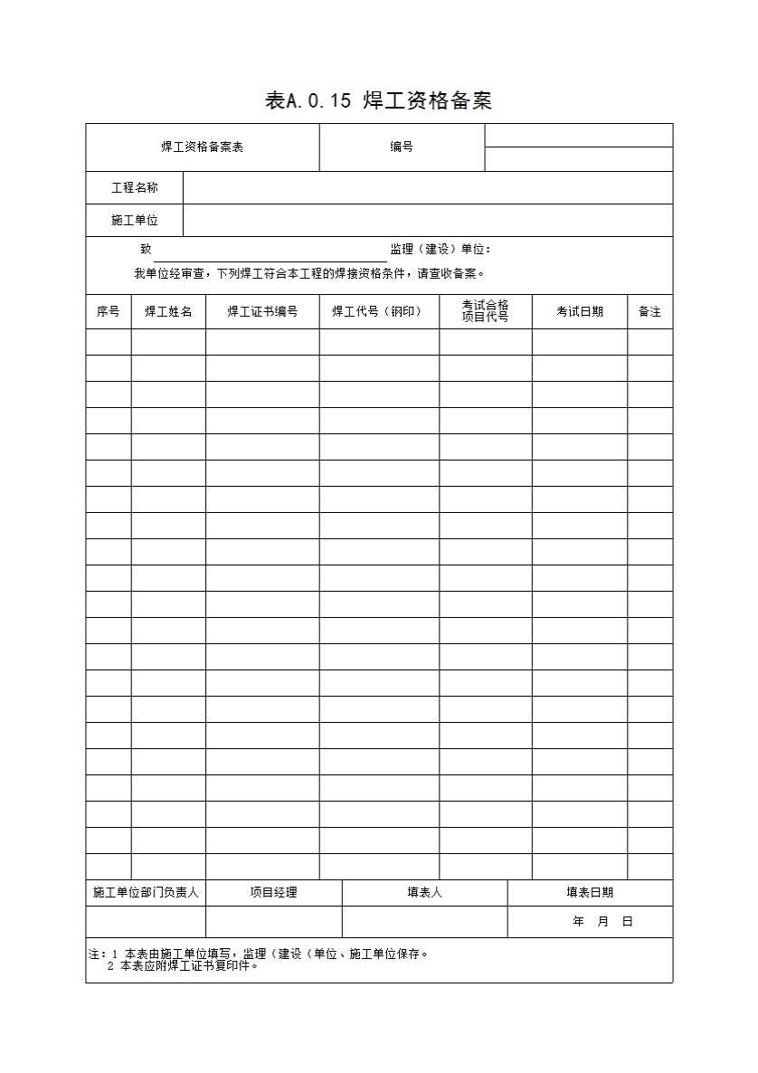 表格名称:表A.0.15 焊工资格备案