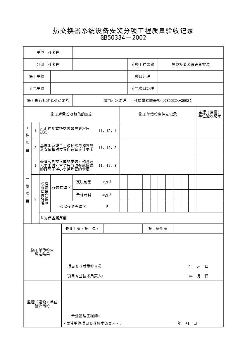 表格名称:35 热交换器系统设备安装分项工程质量验收记录