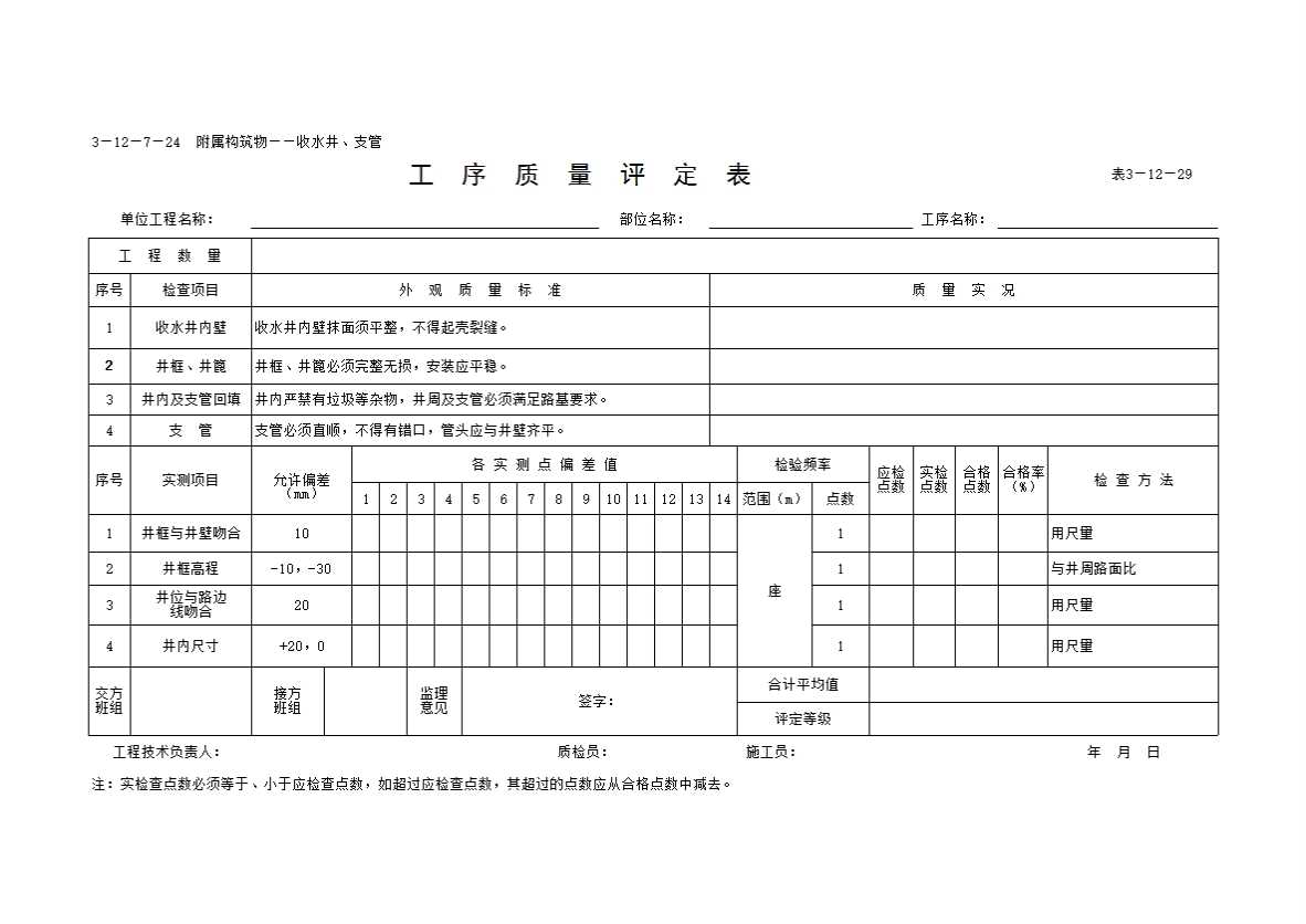 表格名称:工序质量评定表(附属构筑物—收水井、支管)