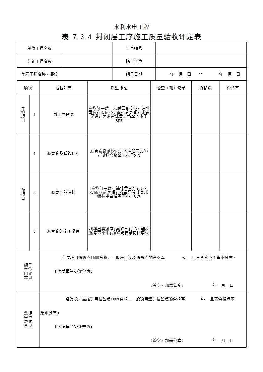 表 7.3.4 封闭层工序施工质量验收评定表