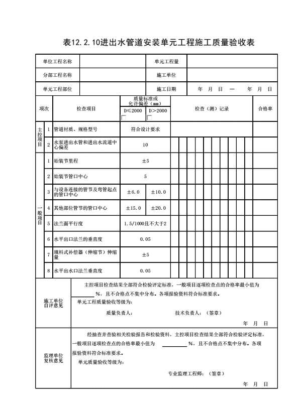 表12.2.10 进出水管道安装单元工程施工质量验收表