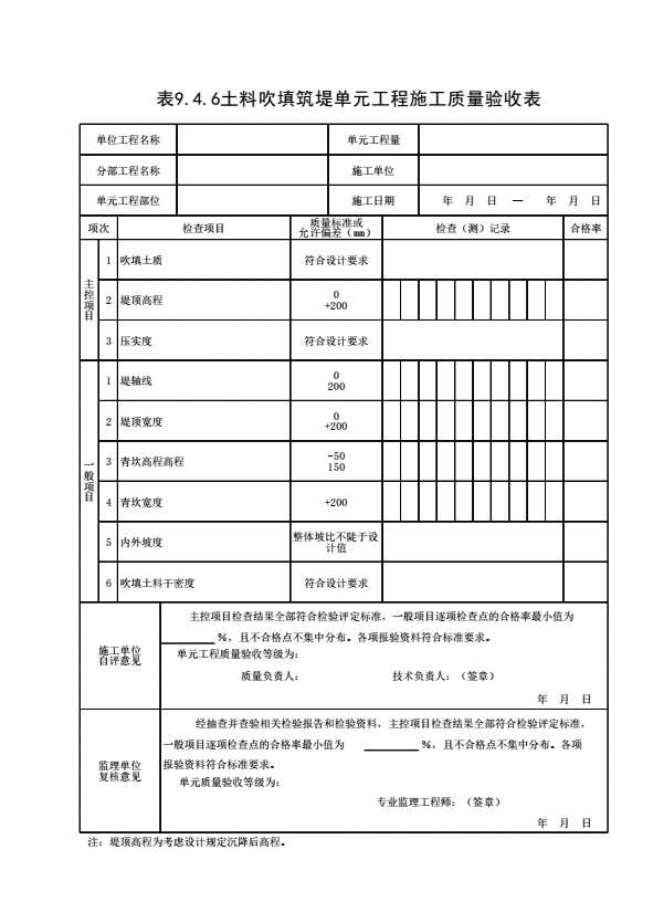 表格名称:表9.4.6 土料吹填筑堤单元工程施工质量验收表