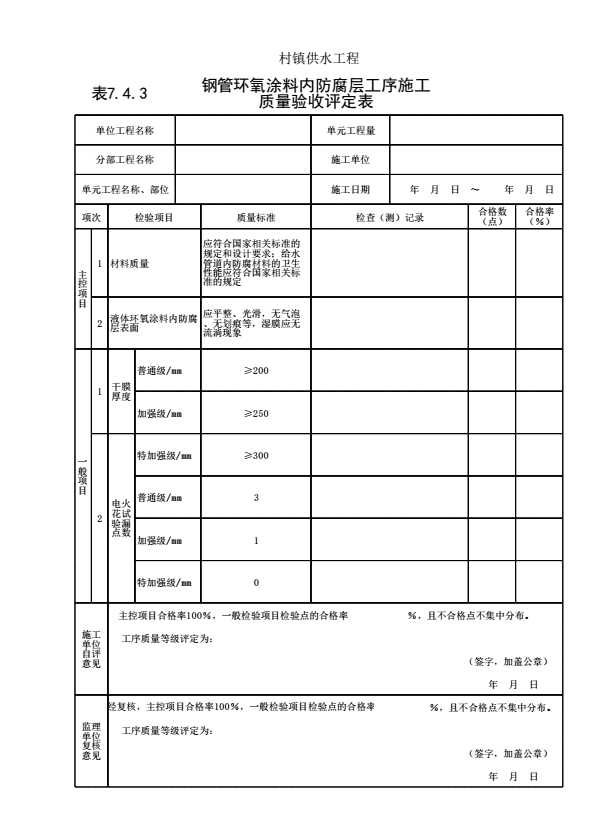 表格名称:表7.4.3 钢管环氧涂料内防腐层工序施工质量验收评定表