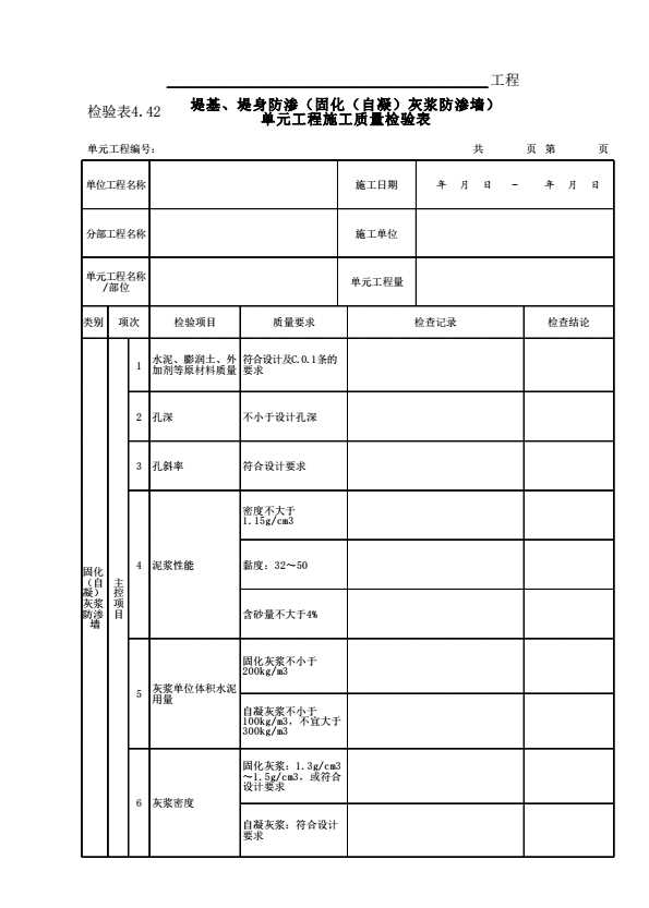 表格名称:表4.42 堤基、堤身防渗(固化(自凝)灰浆防渗墙)单元工程施工质量检验表