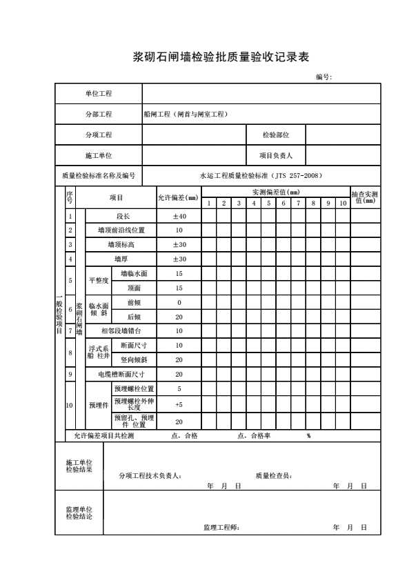 表格名称:浆砌石闸墙检验批质量验收记录表