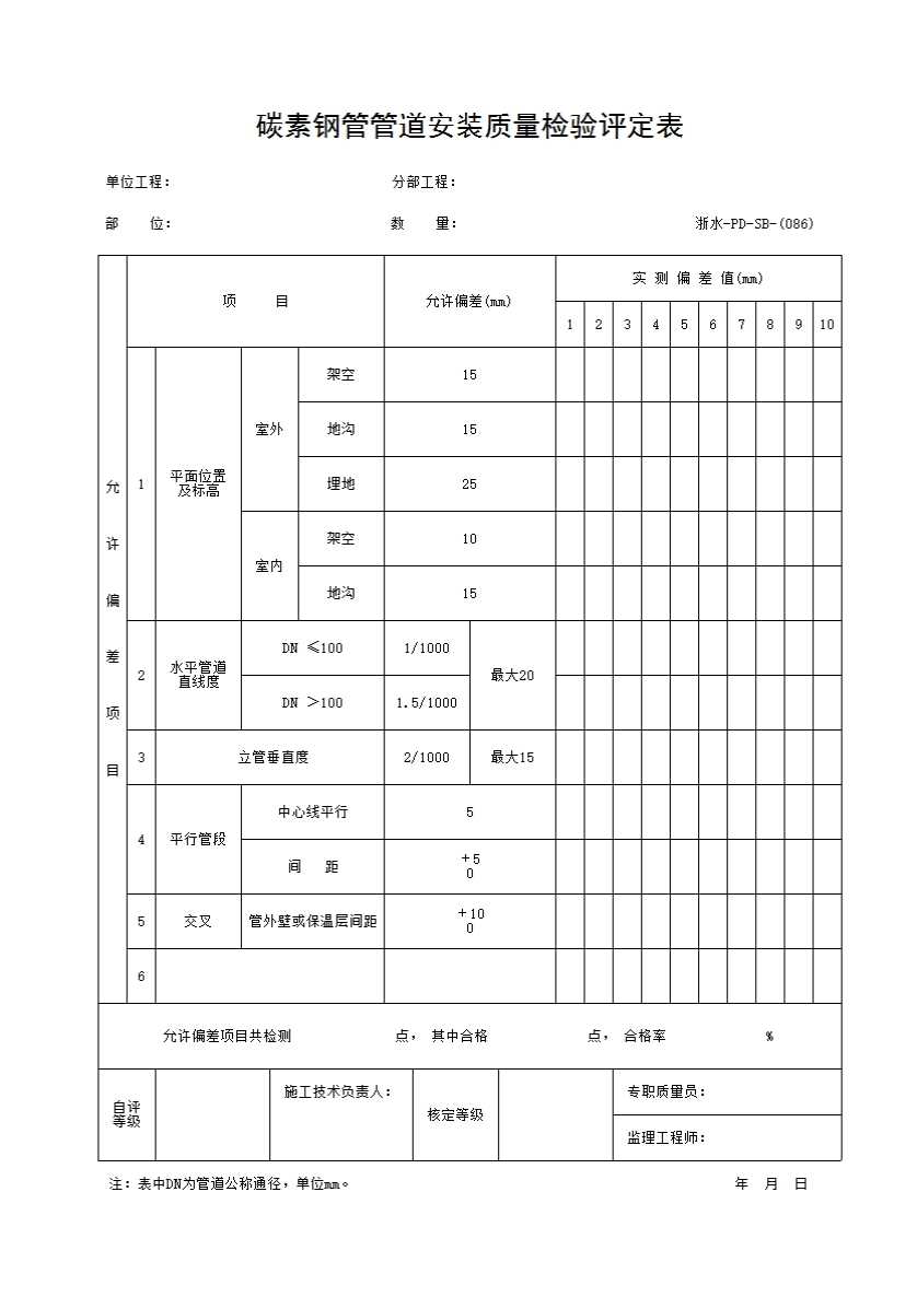 表格名称:086 碳素钢管管道安装质量检验评定表