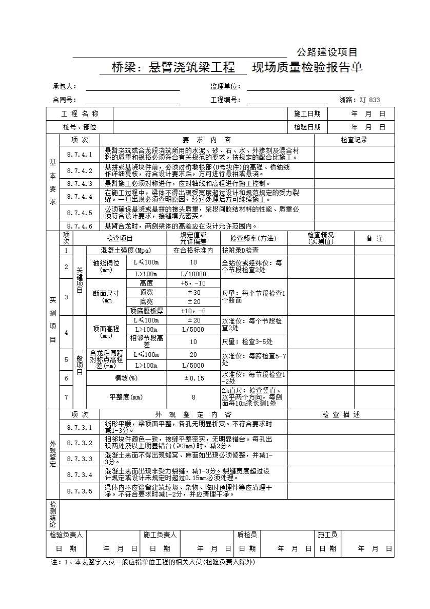 表格名称:浙路ZJ833 桥梁:悬臂浇筑梁工程现场质量检验报告单