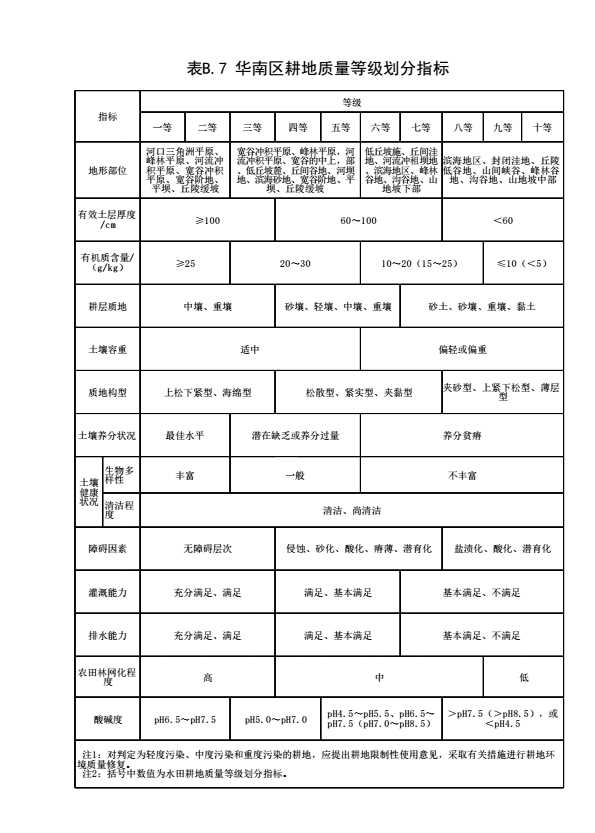 表格名称:表B.7 华南区耕地质量等级划分指标