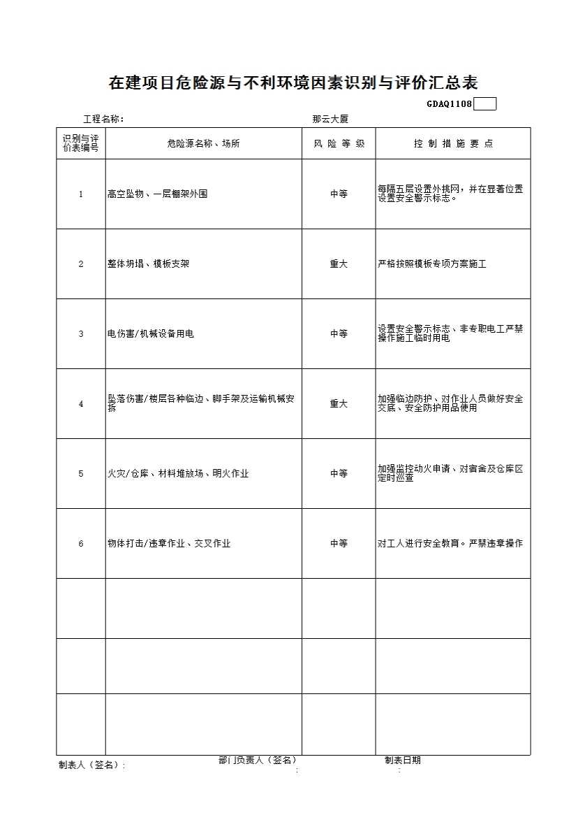 表格名称:8.在建项目危险源与不利环境因素识别与评价汇总表GDAQ1108
