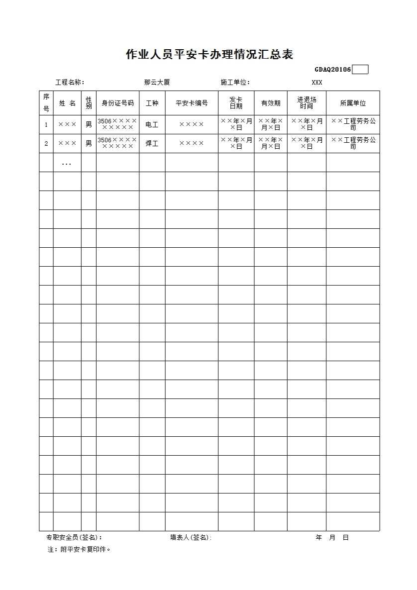 6.作业人员平安卡办理情况汇总表GDAQ20106