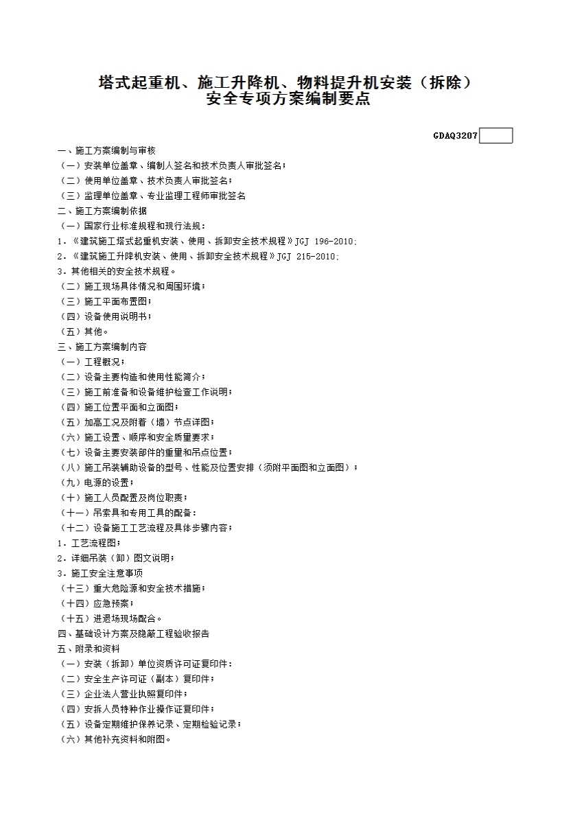 表格名称:7.塔式起重机、施工升降机、物料提升机安装(拆除)安全专项方案编制要点GDAQ3207