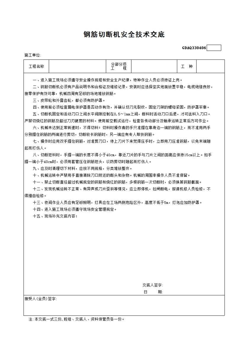 表格名称:6.钢筋切断机安全技术交底GDAQ330406