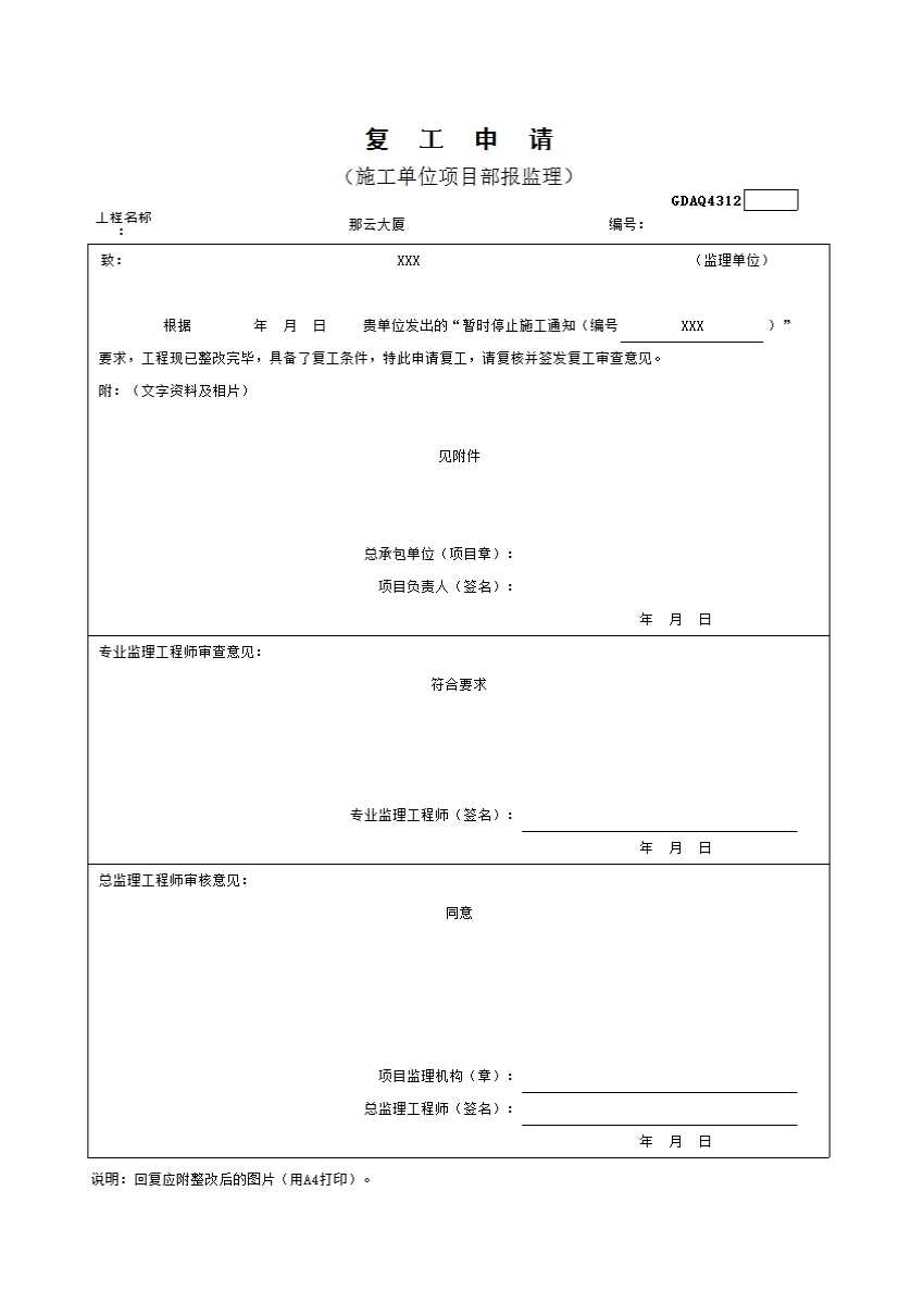 表格名称:12.复工申请(施工单位项目部报监理)GDAQ4312