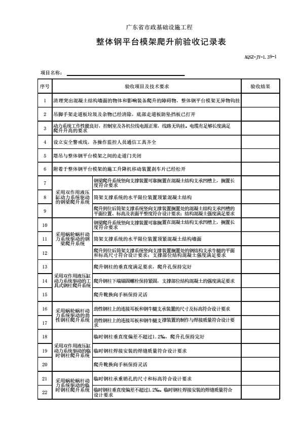 表格名称:AQSZ-JY-1.39-1 整体钢平台模架爬升前验收记录表