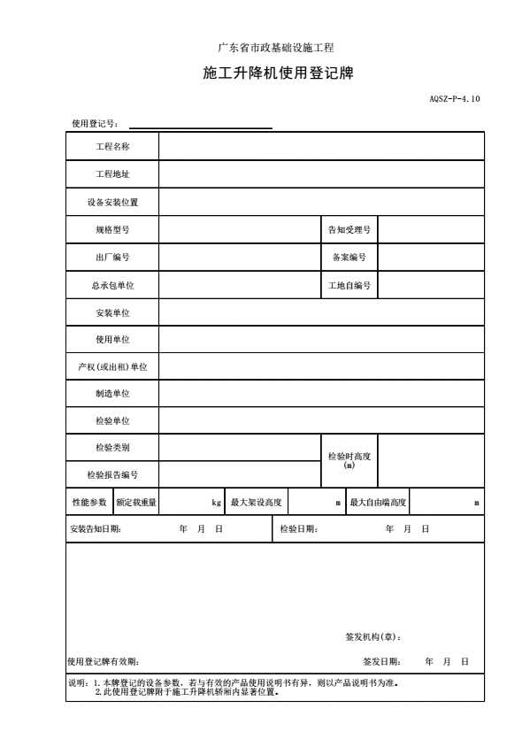 表格名称:AQSZ-P-4.10 施工升降机使用登记牌
